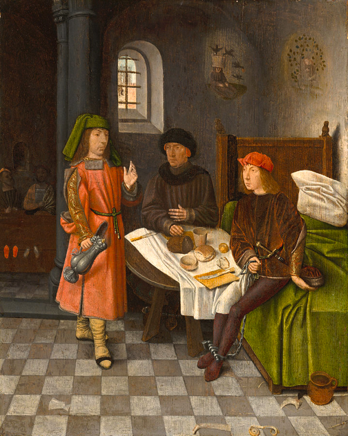 Two paintings I found of this chapter. The first is very colorful, but I am not sure who is who. It looks like the guy on the bed is hiding snacks. The table is very tilted and the knife is making me nervous. The dreams are projected on the wall.